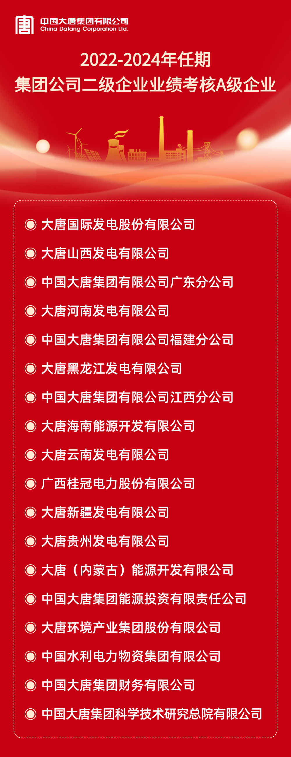 本網訊 根據《中國大唐集團有限公司所屬企業年度業績考核辦法》和《中國大唐集團有限公司所屬企業任期業績考核管理辦法(試行)》及有關規定,2024年度及2022-2024年任期二級企業業績考核結果已經集團公司董事長專題會審議通過。A級企業名單如下: