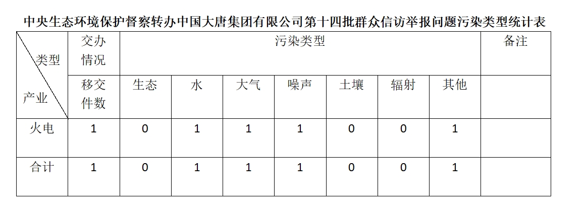 2025年6月20日,中央第七生態環境保護督察組向中國大唐集團有限公司移交第十四批群眾信訪舉報件,共計1件,為來電舉報,涉及水問題1個、大氣問題1個、噪聲問題1個、其他問題1個。所有舉報件辦理工作已第一時間進入調查核實辦理程序,辦理情況將按照相關要求反饋督察組,并及時向社會公開。