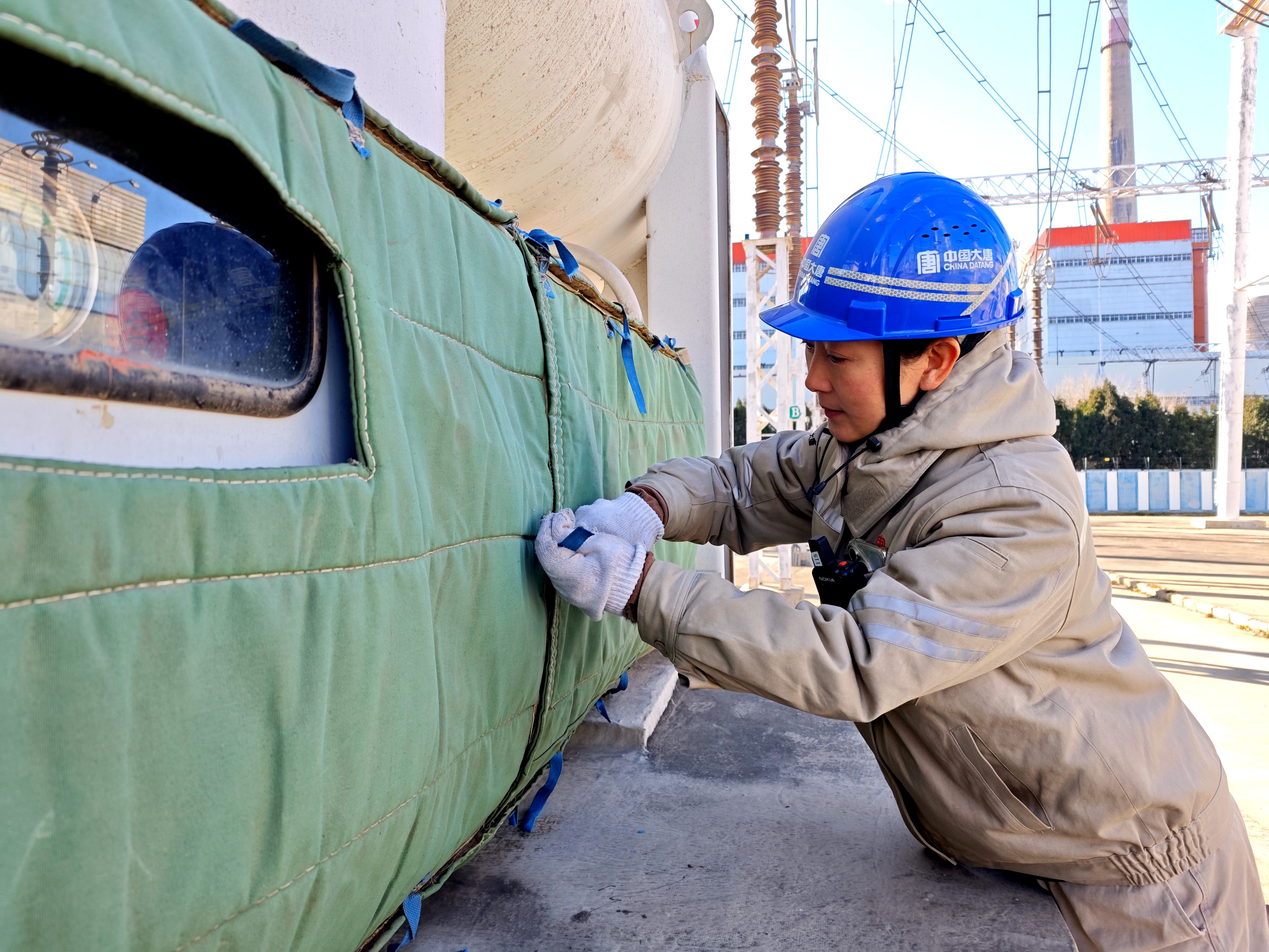 “這個接口處要包嚴實,不能留一點縫隙,不然熱氣都跑了。”班長趙詩宇一邊指導年輕員工郝巖包裹開關接線口,一邊提醒道。郝巖認真點頭,手上動作更加細致:“明白,班長。這保溫棉貼合度真不錯,裁剪得也正合適。”