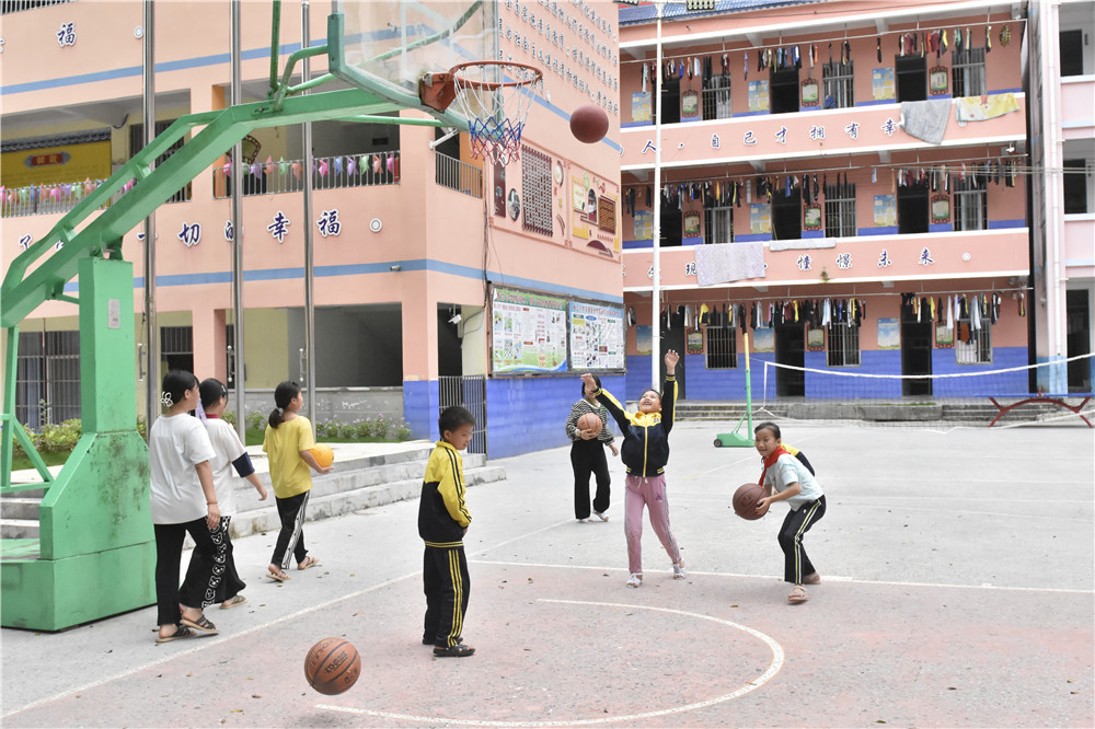 ??????板蘭村小學的孩子們正在球場歡快地投籃